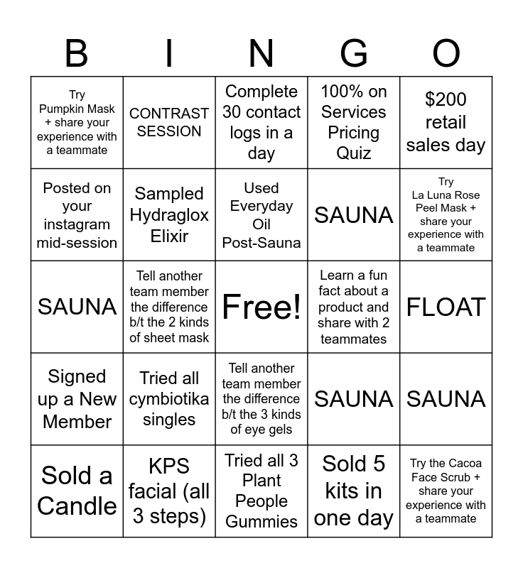 This bingo card has a free space and 24 words: Tried all cymbiotika singles, KPS facial (all 3 steps), Used Everyday Oil Post-Sauna, Sold a Candle, $200 retail sales day, Try Pumpkin Mask + share your experience with a teammate, Posted on your instagram mid-session, CONTRAST SESSION, Learn a fun fact about a product and share with 2 teammates, Tell another team member the difference b/t the 3 kinds of eye gels, SAUNA, SAUNA, SAUNA, SAUNA, Sampled Hydraglox Elixir, Sold 5 kits in one day, FLOAT, Complete 30 contact logs in a day, Try La Luna Rose Peel Mask + share your experience with a teammate, Tell another team member the difference b/t the 2 kinds of sheet mask, Try the Cacoa Face Scrub + share your experience with a teammate, Signed up a New Member, 100% on Services Pricing Quiz and Tried all 3 Plant People Gummies.