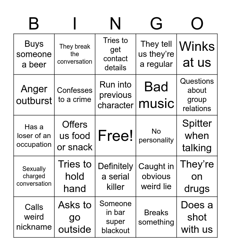 This bingo card has a free space and 24 words: Tries to hold hand, Asks to go outside, Run into previous character, Calls weird nickname, Winks at us, Buys someone a beer, Anger outburst, They break the conversation, No personality, Definitely a serial killer, Bad music, Has a loser of an occupation, Caught in obvious weird lie, They’re on drugs, Confesses to a crime, Breaks something, Spitter when talking, Tries to get contact details, Questions about group relations, Offers us food or snack, Does a shot with us, Sexually charged conversation, They tell us they’re a regular and Someone in bar super blackout.