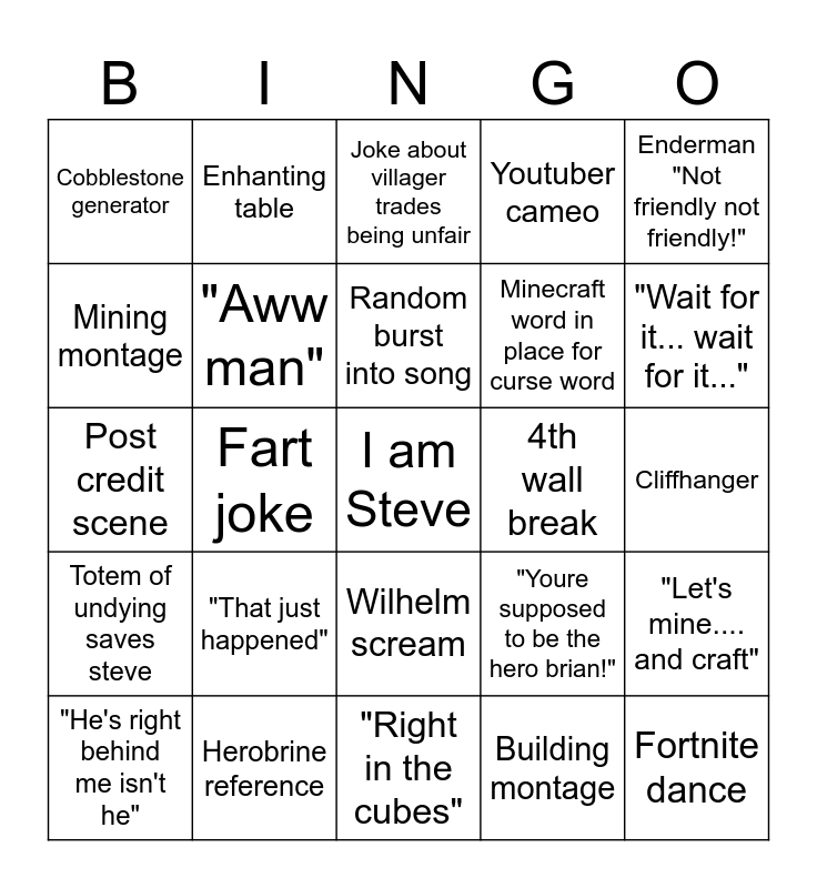 This bingo card has a free space and 24 words: "He's right behind me isn't he", "That just happened", Random burst into song, Building montage, Enderman "Not friendly not friendly!", Cobblestone generator, Enhanting table, Joke about villager trades being unfair, 4th wall break, Cliffhanger, Post credit scene, "Aww man", "Youre supposed to be the hero brian!", "Let's mine.... and craft", Mining montage, Herobrine reference, "Right in the cubes", Youtuber cameo, "Wait for it... wait for it...", Totem of undying saves steve, Fart joke, Wilhelm scream, Minecraft word in place for curse word and Fortnite dance.