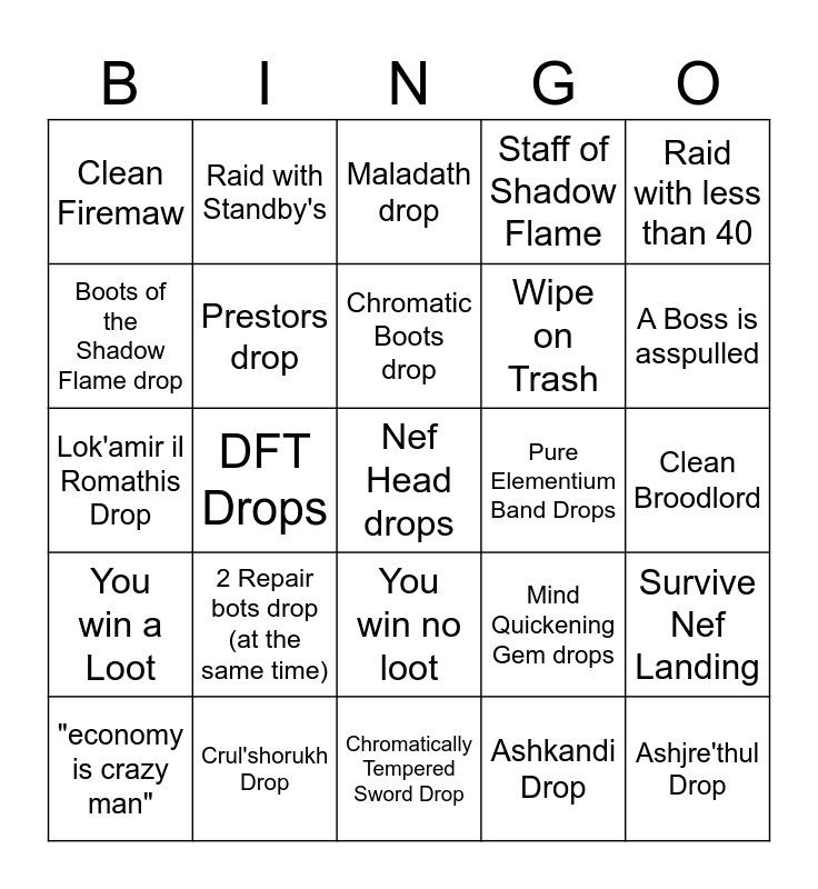 This bingo card has a free space and 31 words: Chromatically Tempered Sword Drop, Mish'undre drop, DFT Drops, Rejuv Gem Drop, Clean Firemaw, Maladath drop, Prestors drop, Mind Quickening Gem drops, Pure Elementium Band Drops, Ashkandi Drop, Clean Broodlord, Ashjre'thul Drop, Neltharion's Tear Drops, Band of Forced concentration drops, A Boss is asspulled, Obscure reference explained, Survive Nef Landing, 2 Repair bots drop (at the same time), You win a Loot, You win no loot, Raid with less than 40, Warrior rips threat on Vael, "economy is crazy man", Raid with Standby's, Wipe on Trash, Boots of the Shadow Flame drop, Staff of Shadow Flame, Lok'amir il Romathis Drop, Crul'shorukh Drop, Chromatic Boots drop and Band of Forced Concentration drop.