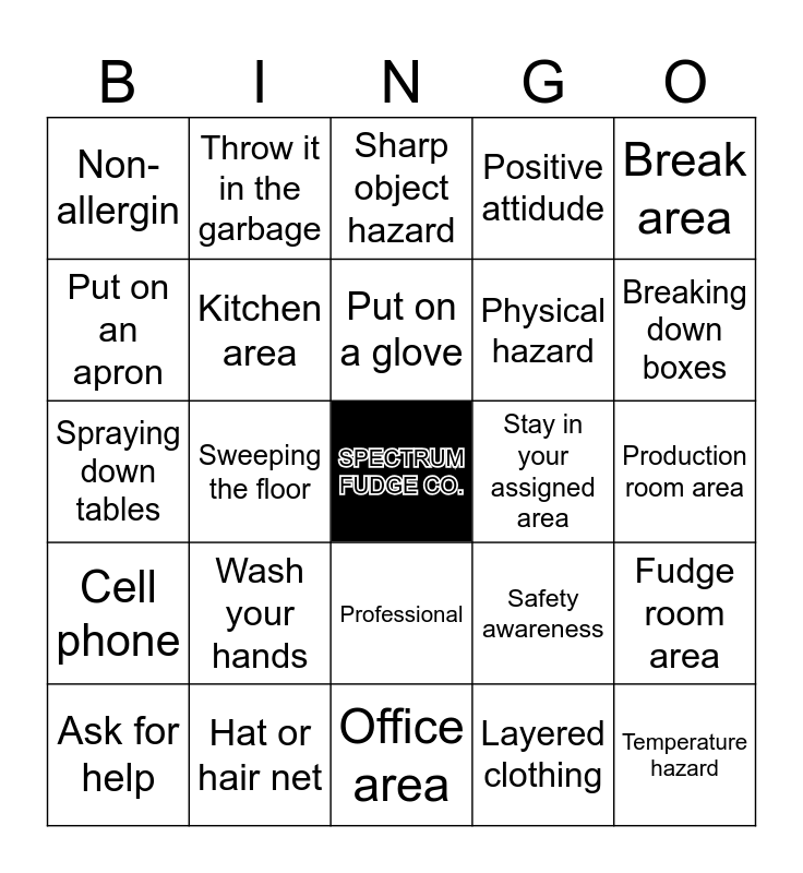 This bingo card has a free space and 24 words: Wash your hands, Hat or hair net, Put on a glove, Ask for help, Break area, Non-allergin, Put on an apron, Throw it in the garbage, Stay in your assigned area, Professional, Physical hazard, Spraying down tables, Safety awareness, Fudge room area, Kitchen area, Layered clothing, Production room area, Sharp object hazard, Breaking down boxes, Sweeping the floor, Temperature hazard, Cell phone, Positive attidude and Office area.