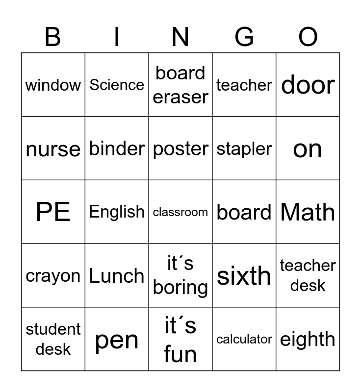 This bingo card has 59 words: Free!, pen, pencil, crayon, calculator, folder, binder, book, stapler, ruler, teacher, student, nurse, principal, hallway, window, classroom, door, wall, poster, board, board eraser, student desk, teacher desk, chair, in front of, in back of, next to, on, under, in, flag, pencil sharpener, glue, Science, French, Spanish, English, Social Studies, PE, Music, Lunch, Math, Technology, schedule, it´s hard, it´s easy, it´s interesting, it´s boring, it´s fun, first, second, third, fourth, fifth, sixth, seventh, eighth and ninth.