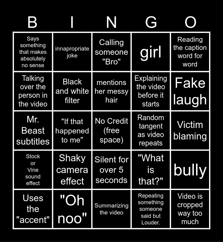 This bingo card has a free space and 29 words: Uses the "accent", Freebooting a freebooted video, "If that happened to me", Random graphic that adds nothing, Says something that makes absolutely no sense, Calling someone "Bro", Black and white filter, Shaky camera effect, Random tangent as video repeats, "Oh noo", Victim blaming, Video is cropped way too much, Summarizing the video, Repeating something someone said but Louder., Fake laugh, "Gasp", Silent for over 5 seconds, Stock or Vine sound effect, Reading the caption word for word, Mr. Beast subtitles, "What is that?", "if that happened to me...", Explaining the video before it starts, Talking over the person in the video, girl, innapropriate joke, bully, mentions her messy hair and me when.