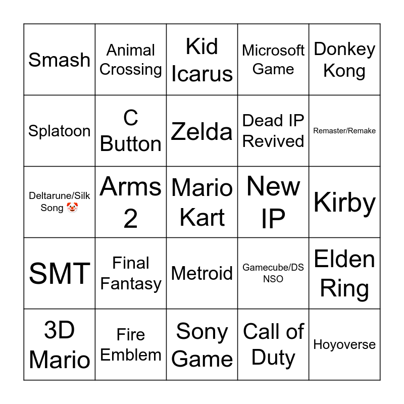 This bingo card has a free space and 24 words: Final Fantasy, Fire Emblem, Zelda, 3D Mario, Donkey Kong, Smash, Splatoon, Animal Crossing, New IP, Metroid, Dead IP Revived, Deltarune/Silk Song 🤡, Gamecube/DS NSO, Elden Ring, C Button, Call of Duty, Kirby, Kid Icarus, Remaster/Remake, Arms 2, Hoyoverse, SMT, Microsoft Game and Sony Game.