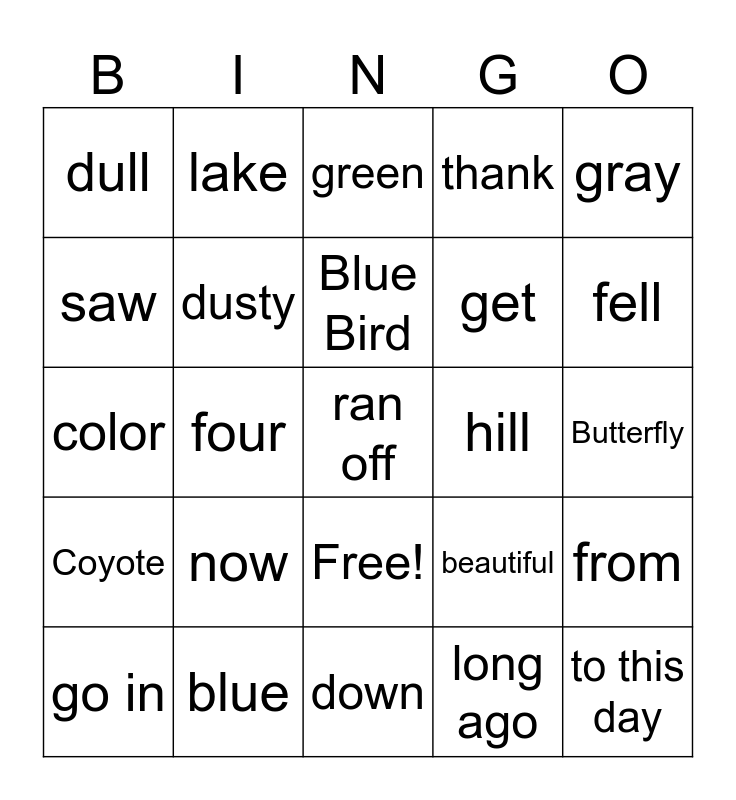 This bingo card has 26 words: Free!, long ago, Blue Bird, blue, gray, dull, saw, lake, Butterfly, beautiful, get, color, from, go in, four, row, thank, Coyote, green, ran off, fell, down, hill, now, dusty and to this day.