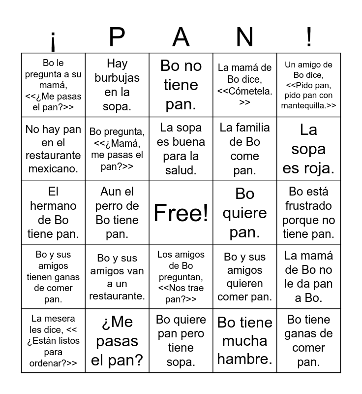 This bingo card has a free space and 30 words: ¿Me pasas el pan?, A Bo no le gusta la sopa., Aun el perro de Bo tiene pan., Bo es un muchacho., Bo le pregunta a su mamá, <<¿Me pasas el pan?>>, Bo no tiene pan., Bo pregunta, <<¿Mamá, me pasas el pan?>>, Los amigos de Bo preguntan, <<Nos trae pan?>>, Bo quiere pan., Bo quiere pan pero tiene sopa., Bo está frustrado porque no tiene pan., Bo tiene ganas de comer pan., Bo tiene mucha hambre., La mesera les pregunta, <<¿Quieren ustedes guacamole?>>, La sopa es roja., Los amigos de Bo tienen mucha hambre., Bo y sus amigos quieren comer pan., Bo y sus amigos tienen ganas de comer pan., Bo y sus amigos van a un restaurante., Un amigo de Bo dice, <<Pido pan, pido pan con mantequilla.>>, El hermano de Bo tiene pan., El perro de Bo tiene pan., Hay burbujas en la sopa., La familia de Bo come pan., No hay pan en el restaurante mexicano., La mamá de Bo dice, <<Cómetela. >>, La mamá de Bo no le da pan a Bo., La mesera les dice, << ¿Están listos para ordenar?>>, La sopa es buena para la salud. and La mesera les dice, >>Sí señores, en seguida.>>.