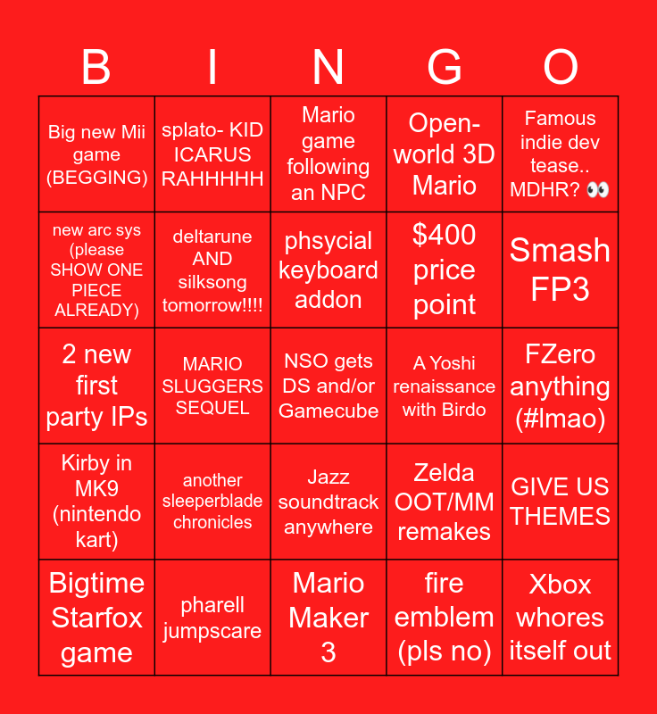 This bingo card has a free space and 24 words: Bigtime Starfox game, another sleeperblade chronicles, phsycial keyboard addon, fire emblem (pls no), Famous indie dev tease.. MDHR? 👀, Big new Mii game (BEGGING), splato- KID ICARUS RAHHHHH, Mario game following an NPC, A Yoshi renaissance with Birdo, FZero anything (#lmao), 2 new first party IPs, deltarune AND silksong tomorrow!!!!, Zelda OOT/MM remakes, GIVE US THEMES, new arc sys (please SHOW ONE PIECE ALREADY), pharell jumpscare, Mario Maker 3, Open-world 3D Mario, Smash FP3, Kirby in MK9 (nintendo kart), MARIO SLUGGERS SEQUEL, Jazz soundtrack anywhere, $400 price point and Xbox whores itself out.