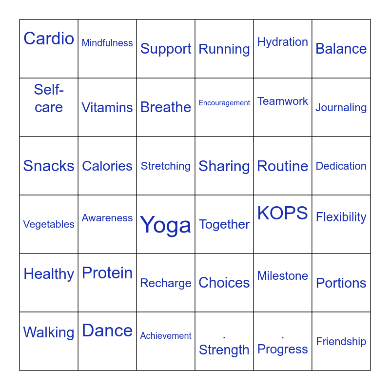 This bingo card has 76 words: Accountability, Friendship, Support, Salad, Holistic, Smoothie, . Strength, Positivity, Achievement, Celebration, Healthy, . Exercise, Vitamins, Balance, . Inspiration, Journaling, Choices, Snacks, Free!, Hydration, Dance, Teamwork, Self-care, Mindfulness, Running, Water, Steps, Motivation, Balance, Meditation, Walking, Energy, Fruits, Vegetables, Encouragement, Breathe, Relaxation, Fitness, Stretching, Flexibility, Aerobics, Goals, Gratitude, Fiber, Movement, Protein, Yoga, Cardio, Rest, Sleep, Recharge, Dedication, Success, . Progress, Focus, . Perseverance, Milestone, Determination, Habits, Results, Routine, Transformation, Empowerment, Family, Maintenance, Scale, Calories, Portions, Tracking, Consistency, Awareness, Sharing, Together, Belonging, KOPS and Resilience.
