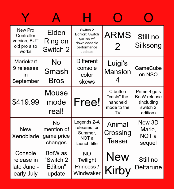 This bingo card has a free space and 24 words: No mention of game price changes, BotW as "Switch 2 Edition" update, Different console color skews, Console release in late June - early July, Still no Silksong, New Pro Controller version, BUT old pro also works, Mariokart 9 releases in September, Elden Ring on Switch 2, C button "casts" the handheld mode to the TV, Legends Z-A releases for Summer, NOT a launch title, Luigi's Mansion 4, $419.99, Animal Crossing Teaser, New 3D Mario, NOT a sequel, No Smash Bros, New Kirby, Prime 4 gets BotW release (including switch 2 edition), Switch 2 Edition: Switch games w/ downloadable performance updates, GameCube on NSO, Mouse mode real!, Still no Deltarune, New Xenoblade, ARMS 2 and NO Twilight Princess / Windwaker.