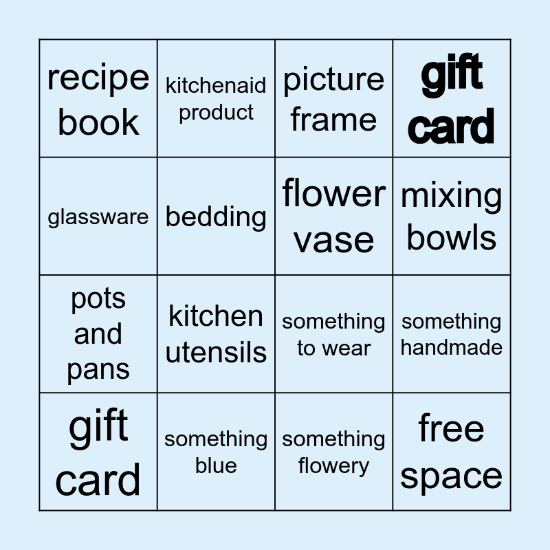 This bingo card has 16 words: something blue, something handmade, picture frame, recipe book, pots and pans, kitchenaid product, something to wear, something flowery, glassware, bedding, gift card, gift card, kitchen utensils, mixing bowls, flower vase and free space.