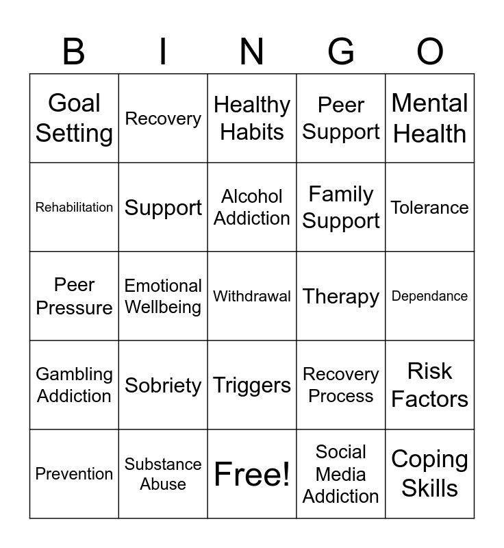 This bingo card has 29 words: Prevention, Addiction, Emotional Wellbeing, Coping Skills, Goal Setting, Healthy Habits, Support, Sobriety, Therapy, Substance Abuse, Dependance, Withdrawal, Free!, Social Media Addiction, Tolerance, Cravings, Triggers, Gambling Addiction, Mental Health, Peer Pressure, Recovery Process, Cycle of Addiction, Family Support, Rehabilitation, Peer Support, Recovery, Risk Factors, Alcohol Addiction and Drug Addiction.