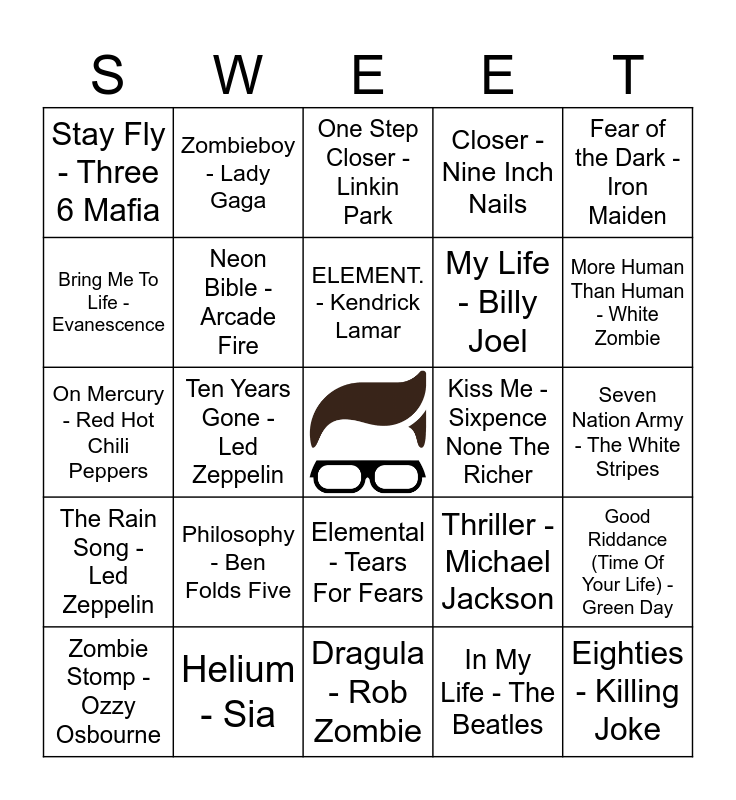 This bingo card has a free space and 40 words: Fields Of Gold - Sting, On Mercury - Red Hot Chili Peppers, Lithium - Nirvana, Neon Bible - Arcade Fire, Helium - Sia, Elemental - Tears For Fears, ELEMENT. - Kendrick Lamar, Galvanize - The Chemical Brothers, Fear of the Dark - Iron Maiden, The Rain Song - Led Zeppelin, Ten Years Gone - Led Zeppelin, Closer - Nine Inch Nails, Eighties - Killing Joke, Seven Nation Army - The White Stripes, Kiss Me - Sixpence None The Richer, Philosophy - Ben Folds Five, Four Sticks - Led Zeppelin, Stay Fly - Three 6 Mafia, Two Of Hearts - Stacey Q, One Step Closer - Linkin Park, Good Riddance (Time Of Your Life) - Green Day, In My Life - The Beatles, My Life - Billy Joel, Bring Me To Life - Evanescence, Sh-Boom - The Crew Cuts, Life's Been Good - Joe Walsh, Life In A Glasshouse - Radiohead, Lifestyles Of The Rich & Famous - Good Charlotte, Semi-Charmed Life - Third Eye Blind, Life On Mars? - David Bowie, Astro Zombies - Misfits, Glenn Danzig, Zombie Stomp - Ozzy Osbourne, Zombie Eaters - Faith No More, Thriller - Michael Jackson, More Human Than Human - White Zombie, Dragula - Rob Zombie, Zombie Zoo - Tom Petty, Time of the Season - The Zombies, Zombieboy - Lady Gaga and Zombie - The Cranberries.