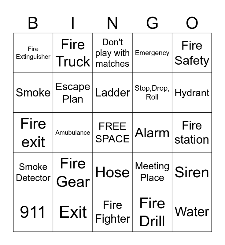 This bingo card has a free space and 24 words: Fire Gear, Exit, Ladder, 911, Fire Safety, Fire Extinguisher, Smoke, Fire Truck, Alarm, Hose, Stop,Drop, Roll, Fire exit, Meeting Place, Siren, Escape Plan, Fire Drill, Fire station, Don't play with matches, Hydrant, Amubulance, Water, Smoke Detector, Emergency and Fire Fighter.