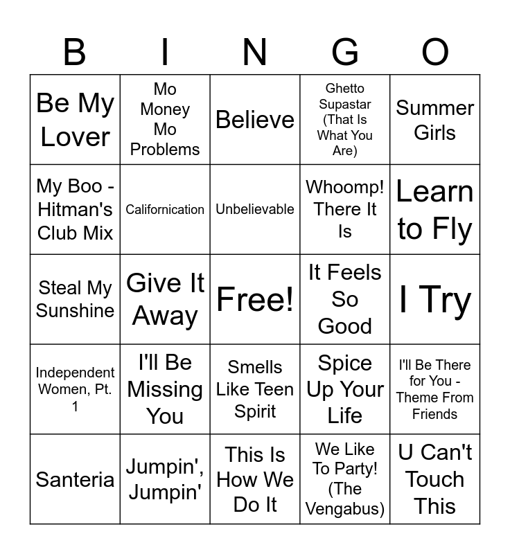 This bingo card has a free space and 50 words: Good Vibrations, U Can't Touch This, Here Comes the Hotstepper - Heartical Mix, This Is How We Do It, I'll Be Missing You, Blue (Da Ba Dee) - Gabry Ponte Ice Pop Radio, Mo Money Mo Problems, Ready or Not, My Boo - Hitman's Club Mix, Butterfly, Californication, Ghetto Supastar (That Is What You Are), I'll Be There for You - Theme From Friends, Spice Up Your Life, Pretty Fly (For A White Guy), C'est La Vie, Unbelievable, It Feels So Good, (You Drive Me) Crazy, Summer Girls, Give It Away, We Like To Party! (The Vengabus), Be My Lover, Whoomp! There It Is, Gettin' Jiggy Wit It, Fly, Learn to Fly, Can't Get Enough Of You Baby, Believe, Smells Like Teen Spirit, Fantasy, Maria Maria, Come on over Baby (All I Want Is You), Waterfalls, Jumpin', Jumpin', Tearin' up My Heart, Mambo No. 5 (A Little Bit of...), Creep, Scar Tissue, I Try, Losing My Religion, My Own Worst Enemy, Thunderstruck, Under the Bridge, Santeria, Steal My Sunshine, Thank You, Remember the Time, Independent Women, Pt. 1 and Two Princes.