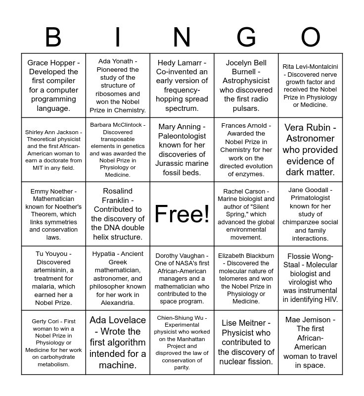 This bingo card has a free space and 30 words: Ada Lovelace - Wrote the first algorithm intended for a machine., Marie Curie - Conducted pioneering research on radioactivity and won two Nobel Prizes., Rosalind Franklin - Contributed to the discovery of the DNA double helix structure., Katherine Johnson - NASA mathematician known for her calculations that helped send astronauts to the moon., Grace Hopper - Developed the first compiler for a computer programming language., Hedy Lamarr - Co-invented an early version of frequency-hopping spread spectrum., Barbara McClintock - Discovered transposable elements in genetics and was awarded the Nobel Prize in Physiology or Medicine., Dorothy Vaughan - One of NASA's first African-American managers and a mathematician who contributed to the space program., Rachel Carson - Marine biologist and author of "Silent Spring," which advanced the global environmental movement., Chien-Shiung Wu - Experimental physicist who worked on the Manhattan Project and disproved the law of conservation of parity., Jane Goodall - Primatologist known for her study of chimpanzee social and family interactions., Mae Jemison - The first African-American woman to travel in space., Lise Meitner - Physicist who contributed to the discovery of nuclear fission., Mary Jackson - NASA's first African-American female engineer., Vera Rubin - Astronomer who provided evidence of dark matter., Sally Ride - The first American woman in space., Elizabeth Blackburn - Discovered the molecular nature of telomeres and won the Nobel Prize in Physiology or Medicine., Tu Youyou - Discovered artemisinin, a treatment for malaria, which earned her a Nobel Prize., Hypatia - Ancient Greek mathematician, astronomer, and philosopher known for her work in Alexandria., Rita Levi-Montalcini - Discovered nerve growth factor and received the Nobel Prize in Physiology or Medicine., Emmy Noether - Mathematician known for Noether's Theorem, which links symmetries and conservation laws., Maria Goeppert Mayer - Developed the nuclear shell model of the atomic nucleus, earning a Nobel Prize in Physics., Ada Yonath - Pioneered the study of the structure of ribosomes and won the Nobel Prize in Chemistry., Frances Arnold - Awarded the Nobel Prize in Chemistry for her work on the directed evolution of enzymes., Shirley Ann Jackson - Theoretical physicist and the first African-American woman to earn a doctorate from MIT in any field., Jocelyn Bell Burnell - Astrophysicist who discovered the first radio pulsars., Flossie Wong-Staal - Molecular biologist and virologist who was instrumental in identifying HIV., Gerty Cori - First woman to win a Nobel Prize in Physiology or Medicine for her work on carbohydrate metabolism., Mary Anning - Paleontologist known for her discoveries of Jurassic marine fossil beds. and Hilde Mangold - Co-discovered the phenomenon of embryonic induction..