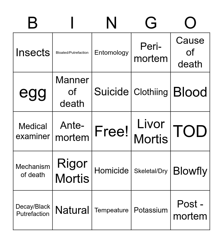This bingo card has a free space and 41 words: Death, Medical examiner, Coroner, Manner of death, Natural, Homicide, Suicide, Accidental, Cause of death, Mechanism of death, Ante-mortem, Peri-mortem, Post - mortem, TOD, Livor Mortis, Rigor Mortis, Algor Mortis, Insects, Decomposition, Entomology, Blowfly, beetle, Tempeature, Clothiing, Hours, Weight, Potassium, Eyes, Blood, Environmental Factors, Fresh/Initial, Bloated/Putrefaction, Decay/Black Putrefaction, Post Deacy/Butyric Fermentation, Skeletal/Dry, egg, larva, pupa, adult, maggot and instar.