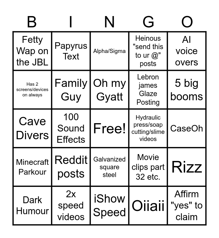 This bingo card has a free space and 33 words: Hawk Tuah, Mewing/Mogging, 100 Sound Effects, Subway Surfers, Minecraft Parkour, Family Guy, AI voice overs, Dark Humour, Papyrus Text, Skibidi Toilet, Oh my Gyatt, Alpha/Sigma, Sprunki, AI cat story videos, Hydraulic press/soap cutting/slime videos, 5 big booms, 2x speed videos, Cave Divers, Reddit posts, Movie clips part 32 etc., Galvanized square steel, Just a Chill Guy, Fetty Wap on the JBL, CaseOh, iShow Speed, Affirm "yes" to claim, Heinous "send this to ur @" posts, Lebron james Glaze Posting, Has 2 screens/devices on always, Rizz, Fanum Tax, Oiiaii and Larry.