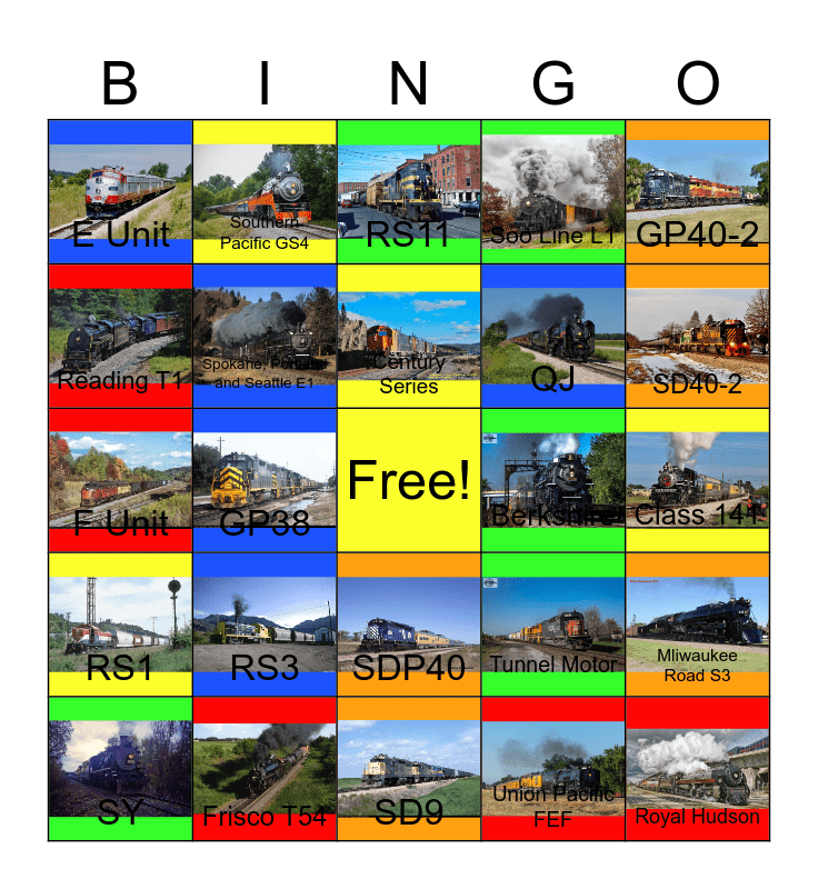 This bingo card has 24 images, a free space and 24 words: RS3, Frisco T54, Century Series, SY, GP40-2, E Unit, Reading T1, Southern Pacific GS4, Berkshire, SDP40, QJ, F Unit, Tunnel Motor, Mliwaukee Road S3, Spokane, Portland and Seattle E1, Union Pacific FEF, Class 141, RS11, SD40-2, GP38, Royal Hudson, RS1, Soo Line L1 and SD9.