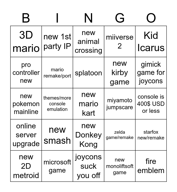 This bingo card has a free space and 24 words: new smash, microsoft game, splatoon, new 2D metroid, Kid Icarus, 3D mario, pro controller new, new 1st party IP, miyamoto jumpscare, new Donkey Kong, new kirby game, new pokemon mainline, zelda game/remake, starfox new/remake, mario remake/port, new monoliftsoft game, console is 400$ USD or less, new animal crossing, gimick game for joycons, themes/more console emulation, fire emblem, online server upgrade, miiverse 2 and joycons suck you off.