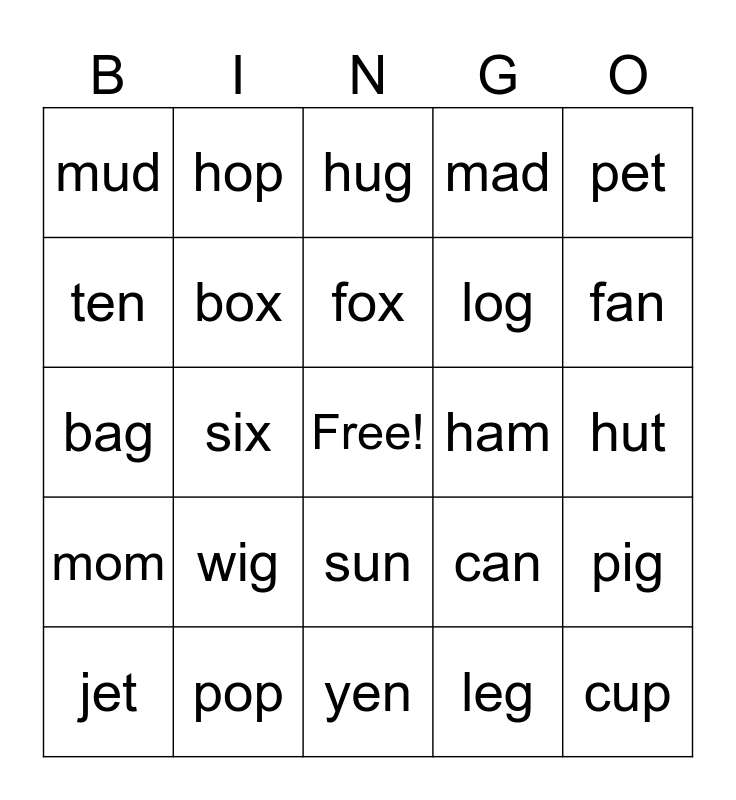 This bingo card has a free space and 35 words: dad, hen, pin, box, sun, mad, ten, dig, fox, cut, bag, pet, zip, top, mud, ham, leg, six, mom, cup, can, jet, pig, pop, hug, fan, pen, win, log, hut, bat, yen, wig, hop and fun.
