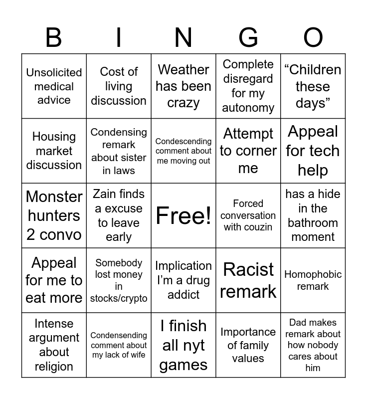 This bingo card has a free space and 24 words: Somebody lost money in stocks/crypto, Condensending comment about my lack of wife, Condescending comment about me moving out, Intense argument about religion, “Children these days”, Unsolicited medical advice, Housing market discussion, Cost of living discussion, Forced conversation with couzin, Implication I’m a drug addict, Attempt to corner me, Monster hunters 2 convo, Racist remark, Homophobic remark, Condensing remark about sister in laws, Importance of family values, has a hide in the bathroom moment, Weather has been crazy, Appeal for tech help, Zain finds a excuse to leave early, Dad makes remark about how nobody cares about him, Appeal for me to eat more, Complete disregard for my autonomy and I finish all nyt games.
