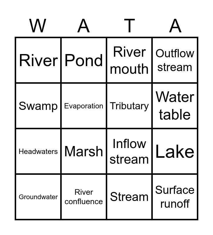 This bingo card has 16 words: River confluence, Lake, River mouth, River, Headwaters, Pond, Inflow stream, Stream, Swamp, Evaporation, Groundwater, Outflow stream, Marsh, Water table, Tributary and Surface runoff.