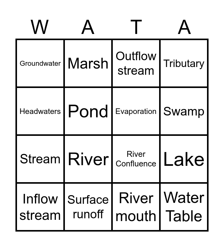 This bingo card has 16 words: Surface runoff, Lake, Outflow stream, Groundwater, Stream, Marsh, River Confluence, River mouth, Headwaters, Pond, Inflow stream, Tributary, River, Swamp, Evaporation and Water Table.