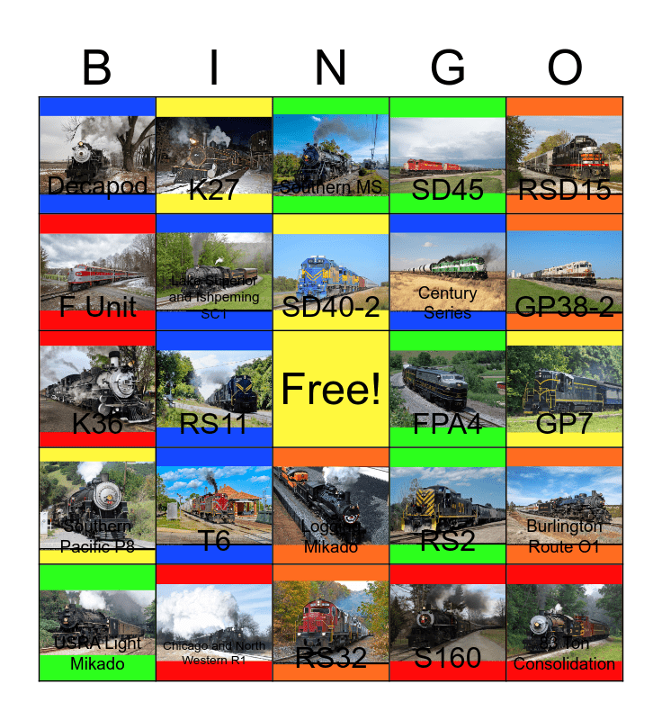 This bingo card has 24 images, a free space and 24 words: T6, Chicago and North Western R1, SD40-2, USRA Light Mikado, RSD15, Decapod, F Unit, K27, FPA4, Logging Mikado, Century Series, K36, RS2, Burlington Route O1, Lake Superior and Ishpeming SC1, S160, GP7, Southern MS, GP38-2, RS11, 83 Ton Consolidation, Southern Pacific P8, SD45 and RS32.