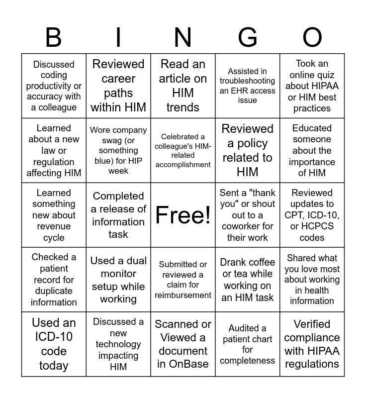 This bingo card has a free space and 29 words: Used an ICD-10 code today, Attended an HIP Week webinar or event, Completed a release of information task, Helped a teammate with a chart audit, Discussed coding productivity or accuracy with a colleague, Read an article on HIM trends, Wore company swag (or something blue) for HIP week, Used a dual monitor setup while working, Sent a "thank you" or shout out to a coworker for their work, Discussed a new technology impacting HIM, Reviewed updates to CPT, ICD-10, or HCPCS codes, Verified compliance with HIPAA regulations, Scanned or Viewed a document in OnBase, Audited a patient chart for completeness, Educated someone about the importance of HIM, Worked with a physician on documentation improvement, Submitted or reviewed a claim for reimbursement, Checked a patient record for duplicate information, Took an online quiz about HIPAA or HIM best practices, Learned something new about revenue cycle, Drank coffee or tea while working on an HIM task, Took a walk/stretch break between HIM tasks, Reviewed a policy related to HIM, Learned about a new law or regulation affecting HIM, Assisted in troubleshooting an EHR access issue, Reviewed career paths within HIM, Shared what you love most about working in health information, Celebrated a colleague's HIM-related accomplishment and Looked up an unusual or complex ICD-10-CM or PCS code.