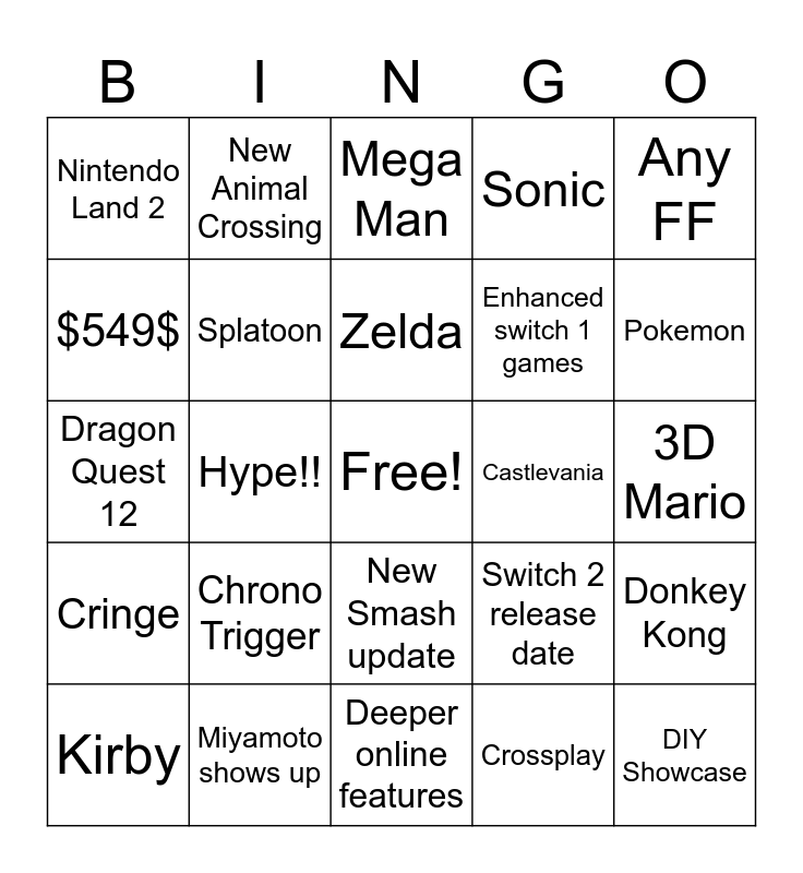 This bingo card has a free space and 24 words: Chrono Trigger, Miyamoto shows up, Zelda, Kirby, Any FF, Nintendo Land 2, $549$, New Animal Crossing, Castlevania, New Smash update, Enhanced switch 1 games, Dragon Quest 12, Switch 2 release date, Donkey Kong, Splatoon, Crossplay, 3D Mario, Mega Man, Pokemon, Hype!!, DIY Showcase, Cringe, Sonic and Deeper online features.