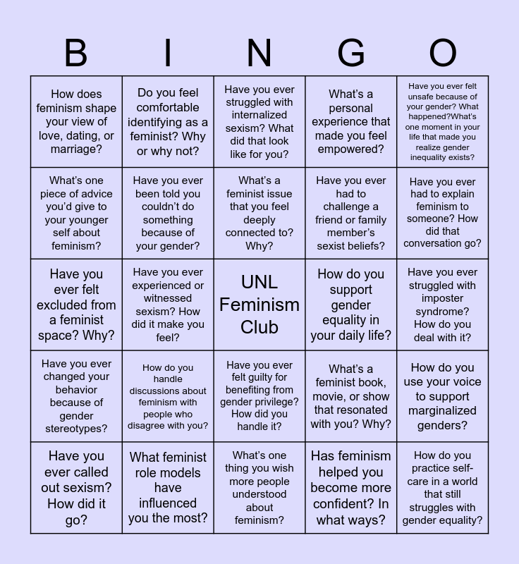 This bingo card has a free space and 33 words: When did you first hear about feminism, and what did you think of it?, Has your view of feminism changed over time? If so, how?, Have you ever experienced or witnessed sexism? How did it make you feel?, What are some gender expectations you were raised with? Do they still affect you?, Have you ever changed your behavior because of gender stereotypes?, Have you ever been told you couldn’t do something because of your gender?, Have you ever felt unsafe because of your gender? What happened?What’s one moment in your life that made you realize gender inequality exists?, Have you ever called out sexism? How did it go?, Do you feel comfortable identifying as a feminist? Why or why not?, Has anyone ever challenged your feminist beliefs? How did you respond?, What’s a feminist issue that you feel deeply connected to? Why?, Have you ever struggled with internalized sexism? What did that look like for you?, How do you respond when someone says, "I’m not a feminist, but I believe in equality"?, Have you ever felt pressured to look or act a certain way because of gender norms?, How do you support gender equality in your daily life?, Have you ever had to explain feminism to someone? How did that conversation go?, What feminist role models have influenced you the most?, Have you ever felt excluded from a feminist space? Why?, How do you handle discussions about feminism with people who disagree with you?, What’s a feminist book, movie, or show that resonated with you? Why?, Have you ever felt guilty for benefiting from gender privilege? How did you handle it?, What’s one way you wish you could be a better feminist?, How does feminism shape your view of love, dating, or marriage?, Have you ever struggled with imposter syndrome? How do you deal with it?, What’s one thing you wish more people understood about feminism?, How do you practice self-care in a world that still struggles with gender equality?, What’s a personal experience that made you feel empowered?, Have you ever had to challenge a friend or family member’s sexist beliefs?, What’s one piece of advice you’d give to your younger self about feminism?, How do you use your voice to support marginalized genders?, What’s something you’ve unlearned about gender roles?, Has feminism helped you become more confident? In what ways? and If you could create one law or policy to promote gender equality, what would it be?.