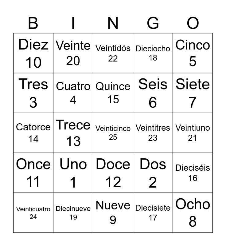 This bingo card has a free space and 24 words: Uno 1, Diecinueve 19, Quince 15, Veinticuatro 24, Cinco 5, Diez 10, Tres 3, Veinte 20, Veintitres 23, Doce 12, Seis 6, Catorce 14, Dos 2, Dieciséis 16, Cuatro 4, Diecisiete 17, Veintiuno 21, Veintidós 22, Siete 7, Trece 13, Ocho 8, Once 11, Dieciocho 18 and Nueve 9.