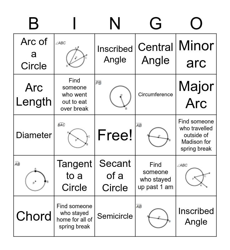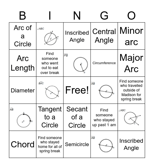 This bingo card has 12 images, a free space and 20 words: Find someone who went out to eat over break, Minor arc, Central Angle, Inscribed Angle, Chord, Diameter, Secant of a Circle, Tangent to a Circle, Find someone who stayed up past 1 am, Radius, Find someone who travelled outside of Madison for spring break, Find someone who stayed home for all of spring break, Inscribed Angle, Central Angle, Circumference, Arc Length, Arc of a Circle, Semicircle, Minor Arc and Major Arc.