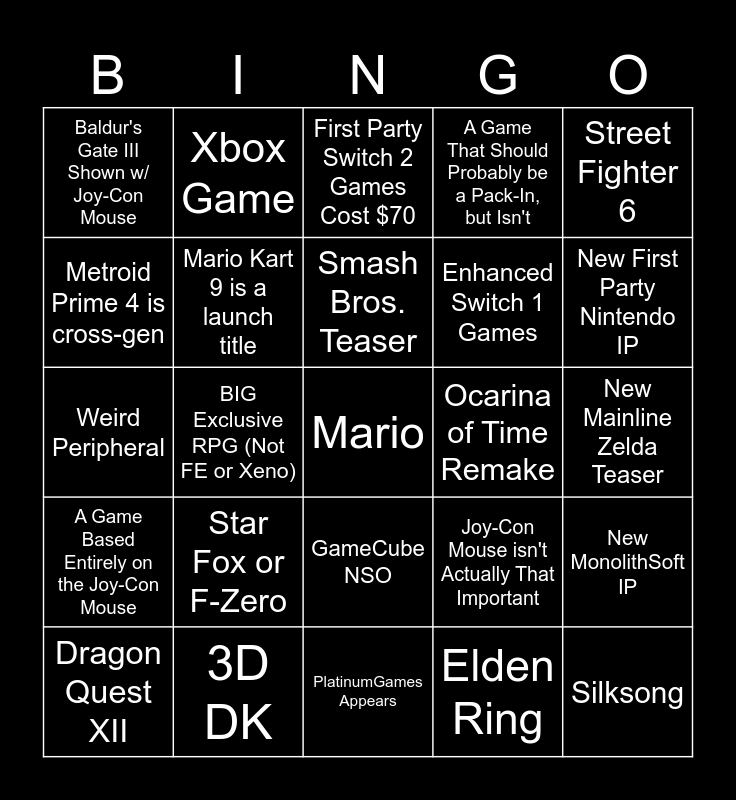 This bingo card has a free space and 24 words: Star Fox or F-Zero, 3D DK, Smash Bros. Teaser, Dragon Quest XII, Street Fighter 6, Baldur's Gate III Shown w/ Joy-Con Mouse, Metroid Prime 4 is cross-gen, Xbox Game, Ocarina of Time Remake, GameCube NSO, Enhanced Switch 1 Games, Weird Peripheral, Joy-Con Mouse isn't Actually That Important, New MonolithSoft IP, Mario Kart 9 is a launch title, Elden Ring, New Mainline Zelda Teaser, First Party Switch 2 Games Cost $70, New First Party Nintendo IP, BIG Exclusive RPG (Not FE or Xeno), Silksong, A Game Based Entirely on the Joy-Con Mouse, A Game That Should Probably be a Pack-In, but Isn't and PlatinumGames Appears.