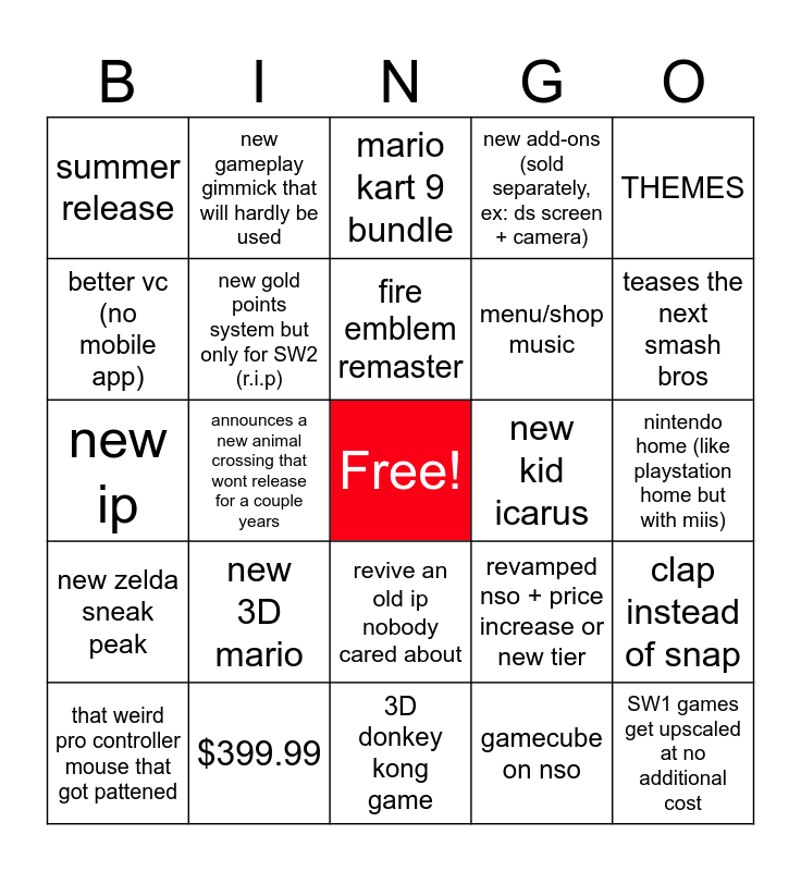 This bingo card has a free space and 24 words: new 3D mario, $399.99, fire emblem remaster, that weird pro controller mouse that got pattened, THEMES, summer release, better vc (no mobile app), new gameplay gimmick that will hardly be used, new kid icarus, revive an old ip nobody cared about, menu/shop music, new ip, revamped nso + price increase or new tier, clap instead of snap, new gold points system but only for SW2 (r.i.p), gamecube on nso, nintendo home (like playstation home but with miis), mario kart 9 bundle, teases the next smash bros, announces a new animal crossing that wont release for a couple years, SW1 games get upscaled at no additional cost, new zelda sneak peak, new add-ons (sold separately, ex: ds screen + camera) and 3D donkey kong game.