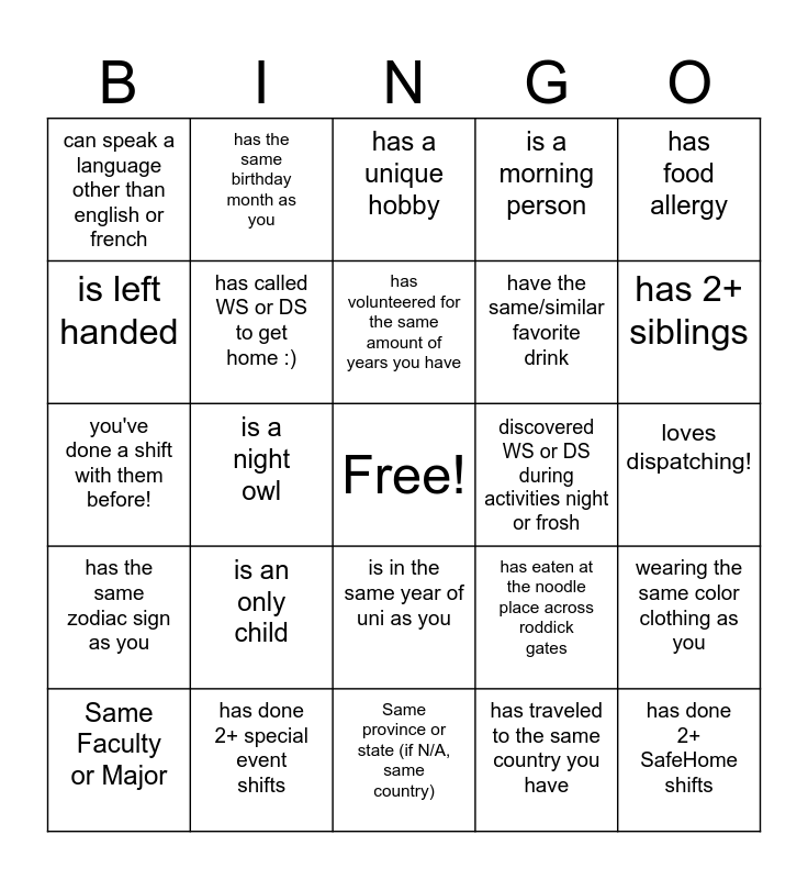 This bingo card has a free space and 24 words: Same Faculty or Major, is an only child, has volunteered for the same amount of years you have, has traveled to the same country you have, has food allergy, can speak a language other than english or french, has the same birthday month as you, has a unique hobby, discovered WS or DS during activities night or frosh, loves dispatching!, you've done a shift with them before!, has called WS or DS to get home :), has eaten at the noodle place across roddick gates, wearing the same color clothing as you, is left handed, has done 2+ special event shifts, Same province or state (if N/A, same country), is a morning person, has 2+ siblings, has the same zodiac sign as you, is a night owl, is in the same year of uni as you, have the same/similar favorite drink and has done 2+ SafeHome shifts.