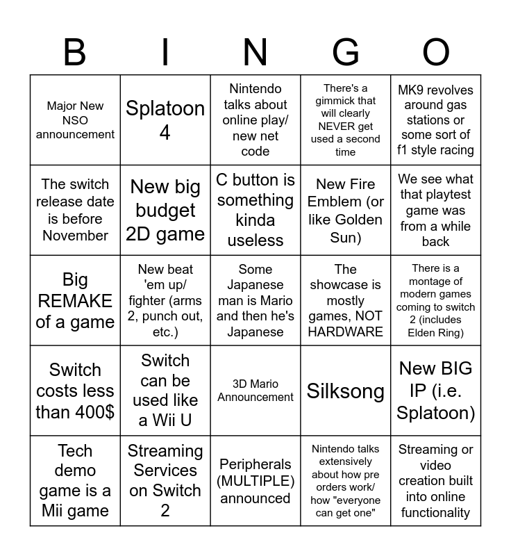 This bingo card has a free space and 24 words: Switch can be used like a Wii U, Streaming Services on Switch 2, C button is something kinda useless, Tech demo game is a Mii game, MK9 revolves around gas stations or some sort of f1 style racing, Major New NSO announcement, The switch release date is before November, Splatoon 4, The showcase is mostly games, NOT HARDWARE, 3D Mario Announcement, New Fire Emblem (or like Golden Sun), Big REMAKE of a game, Silksong, New BIG IP (i.e. Splatoon), New big budget 2D game, Nintendo talks extensively about how pre orders work/ how "everyone can get one", There is a montage of modern games coming to switch 2 (includes Elden Ring), Nintendo talks about online play/ new net code, We see what that playtest game was from a while back, New beat 'em up/ fighter (arms 2, punch out, etc.), Streaming or video creation built into online functionality, Switch costs less than 400$, There's a gimmick that will clearly NEVER get used a second time and Peripherals (MULTIPLE) announced.