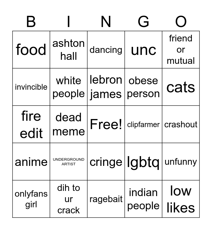 This bingo card has a free space and 24 words: UNDERGROUND ARTIST, dih to ur crack, lebron james, onlyfans girl, friend or mutual, food, invincible, ashton hall, clipfarmer, cringe, obese person, fire edit, lgbtq, unfunny, white people, indian people, crashout, dancing, cats, dead meme, low likes, anime, unc and ragebait.