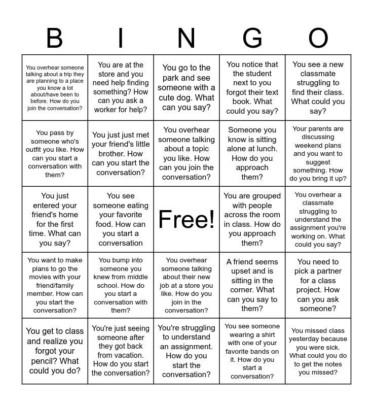 This bingo card has a free space and 24 words: You bump into someone you knew from middle school. How do you start a conversation with them?, You're just seeing someone after they got back from vacation. How do you start the conversation?, You overhear someone talking about a topic you like. How can you join the conversation?, You get to class and realize you forgot your pencil? What could you do?, You see a new classmate struggling to find their class. What could you say?, You overhear someone talking about a trip they are planning to a place you know a lot about/have been to before. How do you join the conversation?, You pass by someone who's outfit you like. How can you start a conversation with them?, You are at the store and you need help finding something? How can you ask a worker for help?, You are grouped with people across the room in class. How do you approach them?, You overhear someone talking about their new job at a store you like. How do you join in the conversation?, Someone you know is sitting alone at lunch. How do you approach them?, You just entered your friend's home for the first time. What can you say?, A friend seems upset and is sitting in the corner. What can you say to them?, You need to pick a partner for a class project. How can you ask someone?, You just just met your friend's little brother. How can you start the conversation?, You see someone wearing a shirt with one of your favorite bands on it. How do you start a conversation?, You overhear a classmate struggling to understand the assignment you're working on. What could you say?, You go to the park and see someone with a cute dog. What can you say?, Your parents are discussing weekend plans and you want to suggest something. How do you bring it up?, You see someone eating your favorite food. How can you start a conversation, You missed class yesterday because you were sick. What could you do to get the notes you missed?, You want to make plans to go the movies with your friend/family member. How can you start the conversation?, You notice that the student next to you forgot their text book. What could you say? and You're struggling to understand an assignment. How do you start the conversation?.