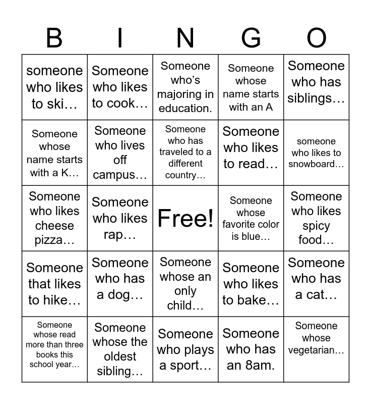 This bingo card has a free space and 24 words: Someone who has a dog…, Someone whose the oldest sibling…, Someone who has traveled to a different country…, Someone whose read more than three books this school year…, Someone who has siblings…, someone who likes to ski…, Someone whose name starts with a K…, Someone who likes to cook…, Someone whose favorite color is blue…, Someone whose an only child…, Someone who likes to read…, Someone who likes cheese pizza…, Someone who likes to bake…, Someone who has a cat…, Someone who lives off campus…, Someone who has an 8am., Someone who likes spicy food…, Someone who’s majoring in education., someone who likes to snowboard…, Someone who likes rap…, Someone whose vegetarian…, Someone that likes to hike…, Someone whose name starts with an A and Someone who plays a sport….