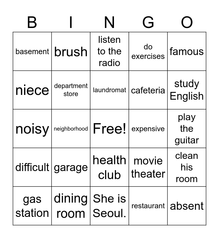 This bingo card has a free space and 24 words: garage, dining room, laundromat, gas station, famous, basement, niece, brush, expensive, health club, cafeteria, noisy, movie theater, clean his room, department store, restaurant, play the guitar, listen to the radio, study English, neighborhood, absent, difficult, do exercises and She is Seoul..