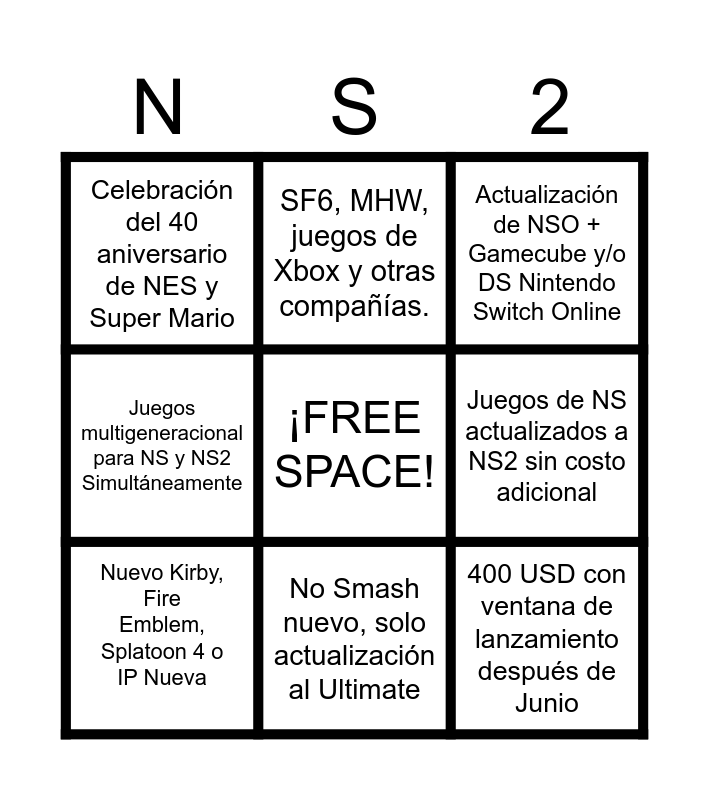 This bingo card has a free space and 8 words: Juegos de NS actualizados a NS2 sin costo adicional, Actualización de NSO + Gamecube y/o DS Nintendo Switch Online, SF6, MHW, juegos de Xbox y otras compañías., Nuevo Kirby, Fire Emblem, Splatoon 4 o IP Nueva, Celebración del 40 aniversario de NES y Super Mario, 400 USD con ventana de lanzamiento después de Junio, Juegos multigeneracional para NS y NS2 Simultáneamente and No Smash nuevo, solo actualización al Ultimate.