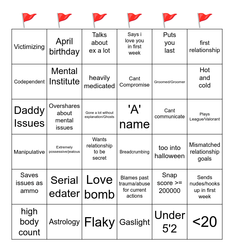 This bingo card has 36 words: Blames past trauma/abuse for current actions, Love bomb, Gaslight, Codependent, Manipulative, 'A' name, Mental Institute, Flaky, Puts you last, Snap score >= 200000, Hot and cold, Says i love you in first week, Sends nudes/hooks up in first week, Overshares about mental issues, Cant Compromise, Victimizing, Saves issues as ammo, Cant communicate, Daddy Issues, Talks about ex a lot, Gone a lot without explanation/Ghosts, Extremely possessive/jealous, Breadcrumbing, Wants relationship to be secret, too into halloween, April birthday, Groomed/Groomer, Astrology, heavily medicated, first relationship, <20, high body count, Mismatched relationship goals, Plays League/Valorant, Serial edater and Under 5'2.