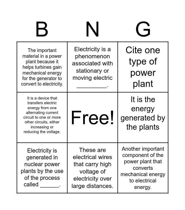 This bingo card has a free space and 8 words: It is the energy generated by the plants, Cite one type of power plant, Electricity is a phenomenon associated with stationary or moving electric _________., Electricity is generated in nuclear power plants by the use of the process called ______., The important material in a power plant because it helps turbines gain mechanical energy for the generator to convert to electricity., Another important component of the power plant that converts mechanical energy to electrical energy., It is a device that transfers electric energy from one alternating current circuit to one or more other circuits, either increasing or reducing the voltage. and These are electrical wires that carry high voltage of electricity over large distances..