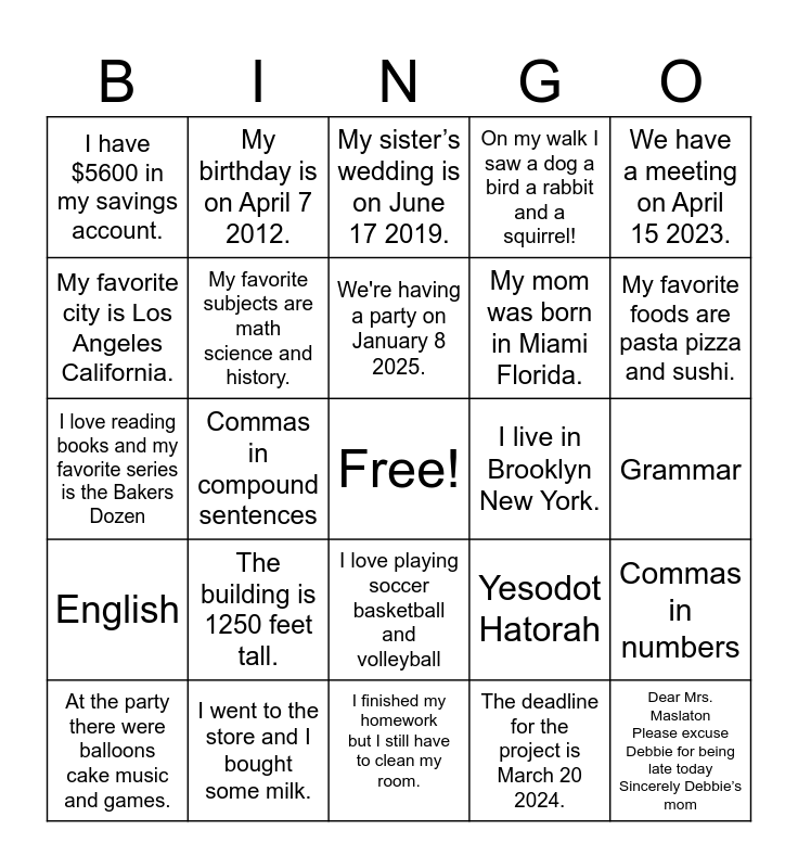 This bingo card has a free space and 44 words: There are 1097 students in the school., Dear Mrs. Maslaton Please excuse Debbie for being late today Sincerely Debbie’s mom, My mom was born in Miami Florida., At the party there were balloons cake music and games., The deadline for the project is November 30 2023., The deadline for the project is March 20 2024., My sister’s wedding is on June 17 2019., I have three pets a dog a cat and a fish., We have a meeting on April 15 2023., I went to the store and I bought some milk., On my walk I saw a dog a bird a rabbit and a squirrel!, I live in Brooklyn New York., I love playing soccer basketball and volleyball, The building is 1250 feet tall., Dear Grandma I love you! Love Mozelle, I finished my homework but I still have to clean my room., My favorite number is 1639282, I love reading books and my favorite series is the Bakers Dozen, My sisters are Fortune Barbara and Dafne, My favorite foods are pasta pizza and sushi., My birthday is on April 7 2012., Dear Barbara Happy birthday! Love Fortune, Marie loves playing guitar but she’s still learning how to play., I have $5600 in my savings account., 4th Grade, Grammar, Commas, Miss. Dayan, Yesodot Hatorah, English, Commas in a series, Commas in numbers, Commas in dates, Commas in letters, Commas in compound sentences, Commas between City and a State, We're going to the beach but we need to bring sunscreen., My favorite food is pizza and I love eating it on Fridays., We're having a party on January 8 2025., My favorite city is Los Angeles California., My mom was born in Miami Florida., I love Pesach Purim and Shavuot, My favorite subjects are math science and history. and I love Succot Chanukka and Rosh Hashana.