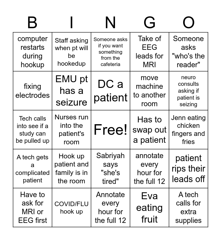 This bingo card has a free space and 24 words: Hook up patient and family is in the room, COVID/FLU hook up, DC a patient, Have to ask for MRI or EEG first, Someone asks "who's the reader", computer restarts during hookup, fixing electrodes, Staff asking when pt will be hookedup, Has to swap out a patient, Sabriyah says "she's tired", move machine to another room, Tech calls into see if a study can be pulled up, annotate every hour for the full 12, patient rips their leads off, EMU pt has a seizure, Eva eating fruit, Jenn eating chicken fingers and fries, Someone asks if you want something from the cafeteria, neuro consults asking if patient is seizing, Nurses run into the patient's room, A tech calls for extra supplies, A tech gets a complicated patient, Take of EEG leads for MRI and Annotate every hour for the full 12.