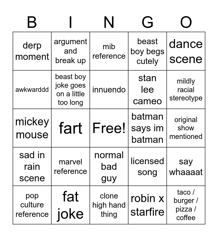 This bingo card has a free space and 24 words: marvel reference, fat joke, innuendo, pop culture reference, dance scene, derp moment, awkwarddd, argument and break up, batman says im batman, normal bad guy, stan lee cameo, mickey mouse, licensed song, say whaaaat, beast boy joke goes on a little too long, robin x starfire, original show mentioned, mib reference, mildly racial stereotype, fart, taco / burger / pizza / coffee, sad in rain scene, beast boy begs cutely and clone high hand thing.