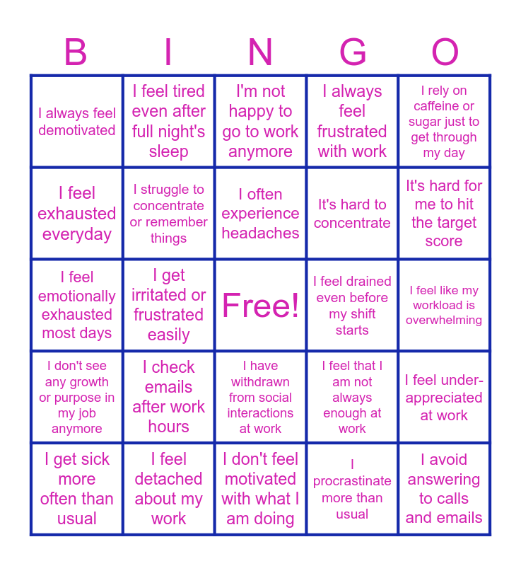 This bingo card has a free space and 24 words: I check emails after work hours, I feel detached about my work, I often experience headaches, I get sick more often than usual, I rely on caffeine or sugar just to get through my day, I always feel demotivated, I feel exhausted everyday, I feel tired even after full night's sleep, I feel drained even before my shift starts, I have withdrawn from social interactions at work, It's hard to concentrate, I feel emotionally exhausted most days, I feel that I am not always enough at work, I feel under-appreciated at work, I struggle to concentrate or remember things, I procrastinate more than usual, I feel like my workload is overwhelming, I'm not happy to go to work anymore, It's hard for me to hit the target score, I get irritated or frustrated easily, I avoid answering to calls and emails, I don't see any growth or purpose in my job anymore, I always feel frustrated with work and I don't feel motivated with what I am doing.
