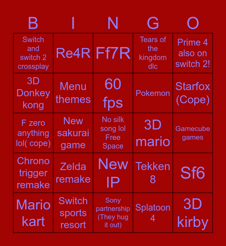 This bingo card has a free space and 24 words: Mario kart, Zelda remake, 60 fps, Splatoon 4, Prime 4 also on switch 2!, Switch and switch 2 crossplay, Re4R, Ff7R, 3D mario, Gamecube games, F zero anything lol( cope), Menu themes, Tekken 8, Sf6, 3D Donkey kong, Switch sports resort, Sony partnership (They hug it out), Tears of the kingdom dlc, Starfox (Cope), Chrono trigger remake, New sakurai game, New IP, Pokemon and 3D kirby.