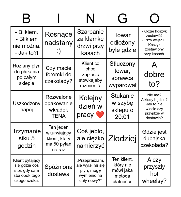 This bingo card has a free space and 24 words: Ten jeden wkurwiający klient, który ma 50 pytań na raz, Spóźniona dostawa, Klient co chce zapłacić stówką aby rozmienić., Klient pytający się gdzie coś stoi, gdy sam stoi obok tego czego szuka., - Gdzie koszyk zostawić? - Przy wejściu. Koszyk zostawiony przy kasach., - Blikiem. - Blikiem nie można. - Jak to?!, Rozlany płyn do płukania po całym sklepie, Rosnące nadstany :), Stukanie w szybę sklepu o 20:01, Coś jebło, ale ciężko namierzyć, Stłuczony towar, sprawca wyparował, Uszkodzony napój, Złodziej, Gdzie jest dubajska czekolada?, Czy macie foremki do czekolady?, Ten klient, który nie mówi jaka metoda płatności., Nie ma? A kiedy będzie? Jak to nie wiecie czy przyjdzie w dostawie?, Szarpanie za klamkę drzwi przy kasach, A dobre to?, Rozwalone opakowanie wkładek TENA, A czy przyszły hot wheelsy?, Trzymanie siku 5 godzin, Towar odłożony byle gdzie and „Przepraszam, ale wylał mi się płyn, mogę wymienić na cały nowy?”.